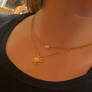 The sun necklace shines beautifully, especially under sunlight, and seems to be of good quality. I haven't seen any discoloration or turning green on the chain or any part of the necklace. Even my 1-year-old frequently grabs and pulls on the chain, but it has remained intact. I would recommend this necklace as a great buy for the price.
